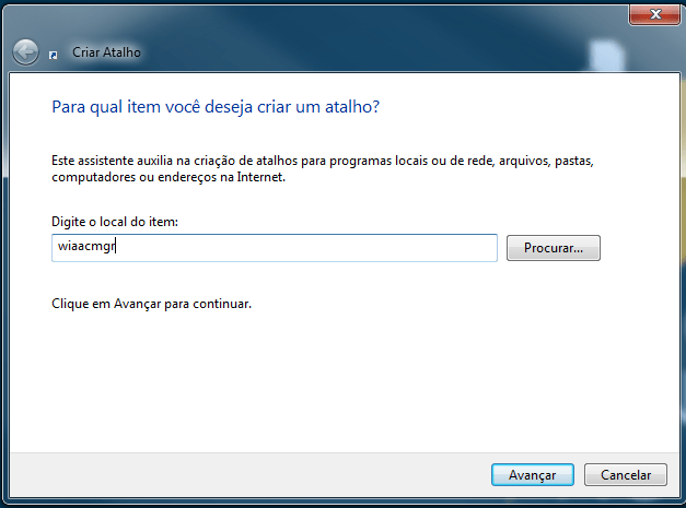 - No local designado ao local do item digite: wiaacmgr e clique em próximo.