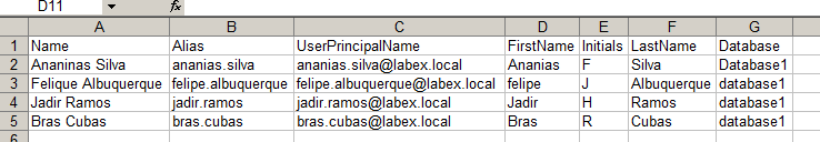 Name,Alias,UserPrincipalName,FirstName,Initials,LastName,Database Ananinas Silva,ananias.silva,[email protected],Ananias,F,Silva,Database1 Felique Albuquerque,felipe.albuquerque,[email protected],felipe,J,Albuquerque,database1 Jadir Ramos,jadir.ramos,[email protected],Jadir,H,Ramos,database1 Bras Cubas,bras.cubas,[email protected],Bras,R,Cubas,database1