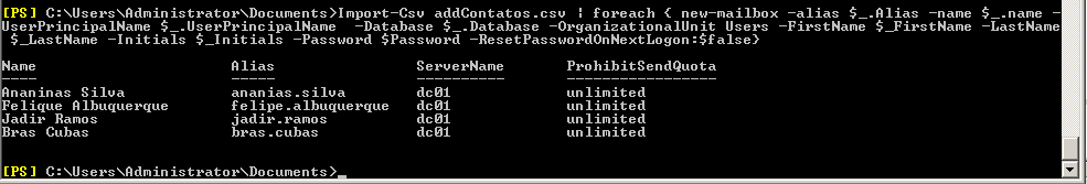 Import-Csv addContatos.csv | foreach { new-mailbox -alias $.Alias -name $.name -UserPrincipalName $.UserPrincipalName -Database $.Database -OrganizationalUnit Users -FirstName $_FirstName -LastName $_LastName -Initials $_Initials -Password $Password -ResetPasswordOnNextLogon:$false}