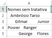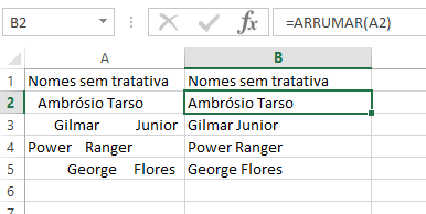 A função arrumar fará com que o Excel retire os espaços em branco do início do texto, do final, e deixe apenas 1 espaço entre as palavras. No exemplo acima, na célula B2 digitamos: