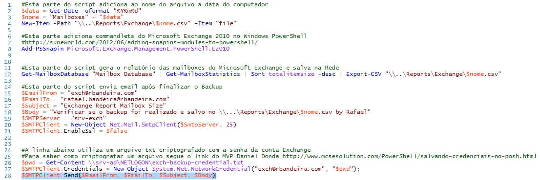 Abaixo segue o script comentado, com os principais pontos que usamos no desenvolvimento do Script: