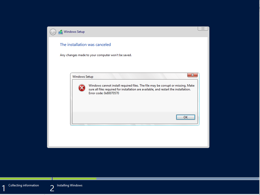 Ao instalarmos o Windows Server 2012R2 aparece a seguinte mensagem de erro: “Windows cannot install required files. The file may be corrupt or missing. Make sure all files required for installation are available, and restart the installation. Error code: 0x80070570″